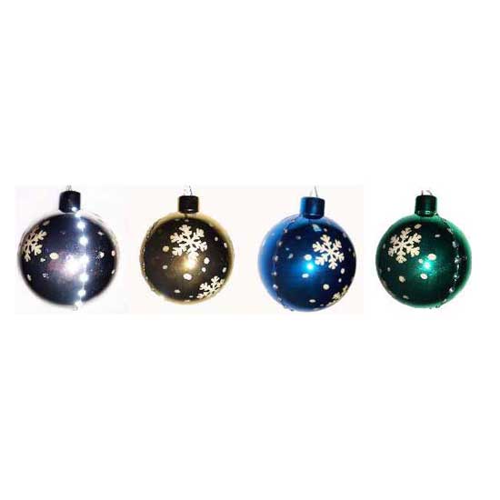 This LED Christmas tree ball boasts a polished reflective finish. The surface is embellished with dotted and snowflake patterns. The light emitting diodes let out fancy illumination. Add holiday elegance to your Christmas tree with this dazzling LED ball ornament.