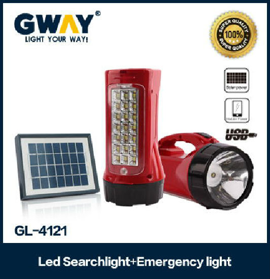 Multifunctional Led searchlight can be as emergency light with USB mobile charger 1) New ABS plastic body 2) 3W LED spotlight+21pcs of 5730SMD LED light 3) Led searchlight can work 20hours,21LED light can work 8hours in "Low" AND 4 hours in "Hi" 4)The Led indicator light will be on when it is charging 5) Build in rechargeable battery(4V2500mAH) 6)5V,650mAH USB to charger mobile 7)can with DC12V Jack 8)Power cable inside the lamp Lumens:100lm+300lm Watt:3W+10W
