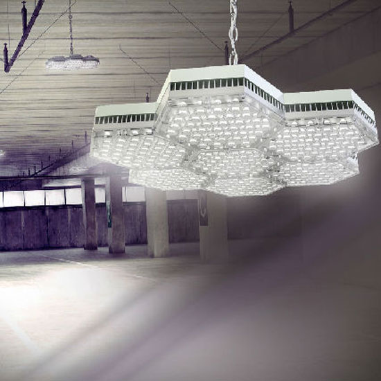 This high bay light with a beehive-like construction flaunts a contemporary touch. It utilizes multiple LEDs for even distribution of light to illuminate large areas. Its special modular construction makes it ideal for many applications.