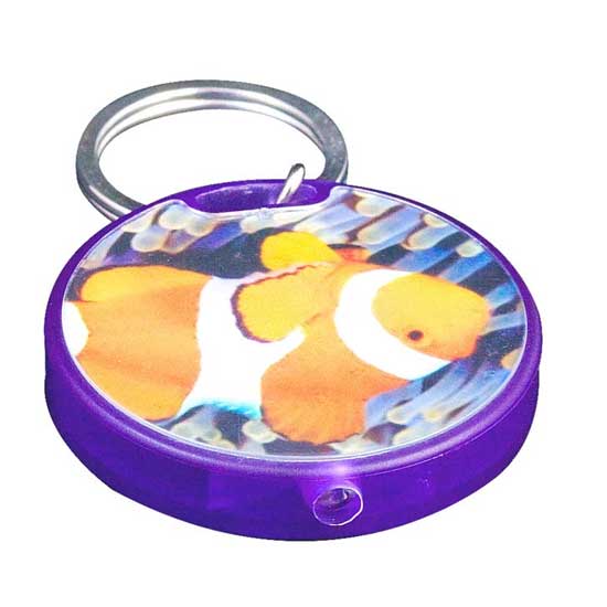 Featured is a round-shaped LED keychain with a transparent body. The goldfish print in the middle adds a touch of uniqueness. This LED keychain is a great gift and premium option.