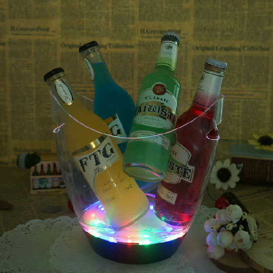 This is a plastic ice bucket that features a neat and clean look due to its transparent body. It comes with two cutout handles for easy transport. This ice bucket offers long-lasting durability.