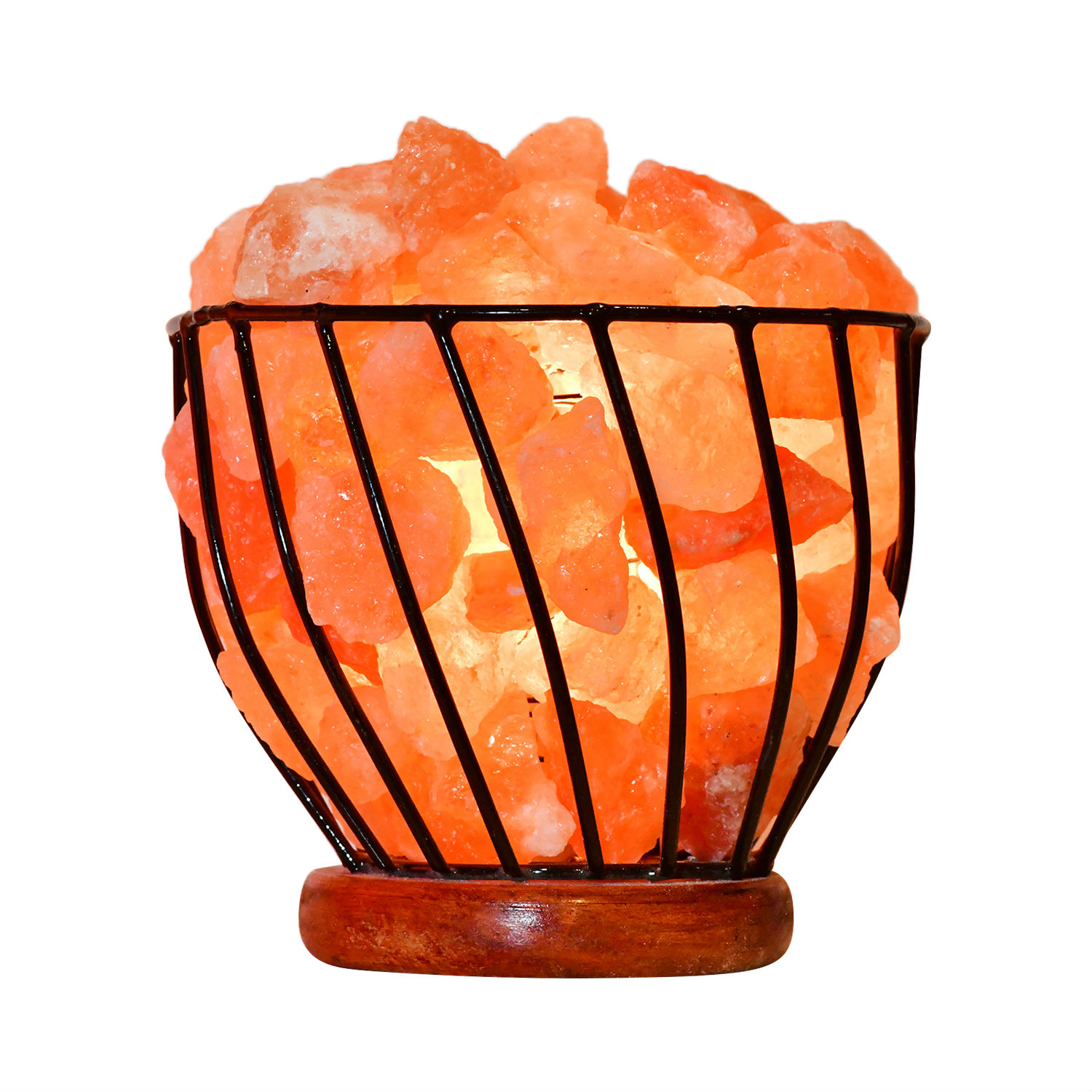 - A salt lamp featuring a basket holding various pieces of rock salt.