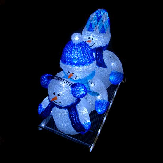 This LED decoration features three snowman figures riding on a sleight. All carry a cheerful smile with a hat and scarf. Letting out fancy illumination, this LED snowman decoration