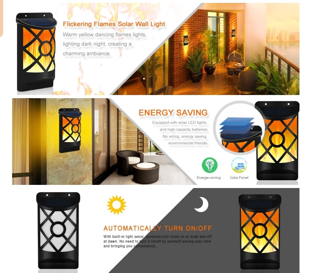 - LED Solar Flickering Flames Energy-Saving Auto on/off Wall Lamp