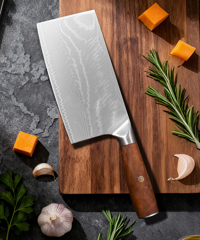 LONGDELI RED SANDALWOOD CLASSIC DAMASCUS PROFESSIONAL CHEF'S KNIFE NO.1 BLADE LENGTH: 178MM | THICKNESS: 2.0MM MATERIAL: 67-LAYER DAMASCUS STEEL | HARDNESS: 60 HRC | PERFORMANCE FAR OUTPERFORMS ORDINARY KNIVES EXCLUSIVELY FOR PROFESSIONAL CHEFS – LONG-LASTING SHARPNESS, ACCURATELY MEETS THE CUTTING REQUIREMENTS OF VARIOUS KITCHEN INGREDIENTS RED SANDALWOOD HANDLE WITH RIVETS AND ROUNDED TIP – ELEGANT BROWN-RED COLOR, COMFORTABLE GRIP