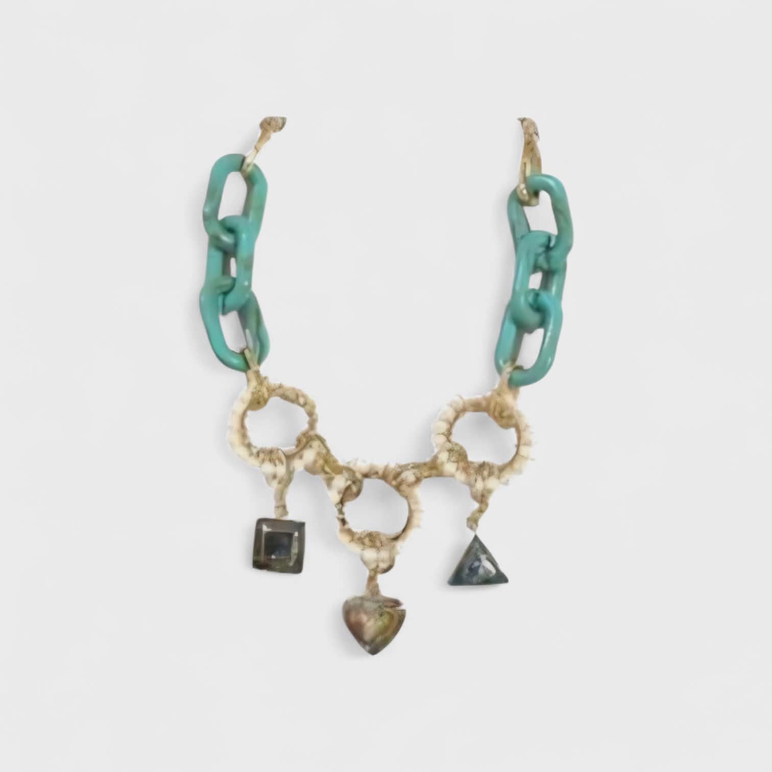 Turquoise acrylic chain with charms made of upcycled plastic sheets made of disposed grocery bags encased in brass accented with freshwater in bloom rings.