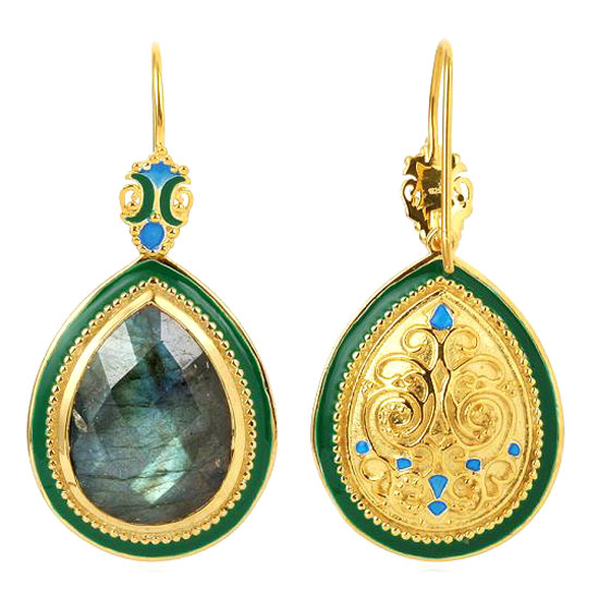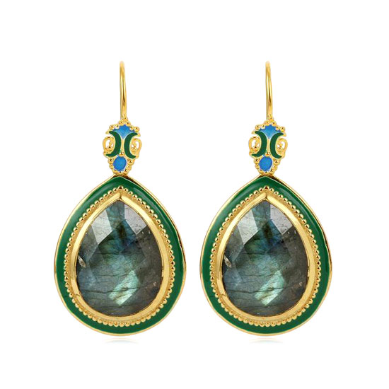 This is a pair of earrings that is made of 925 sterling silver. The large labradorite gemstone adds a touch of style to these earrings. This pair of earrings shimmers with a high-gloss finish.