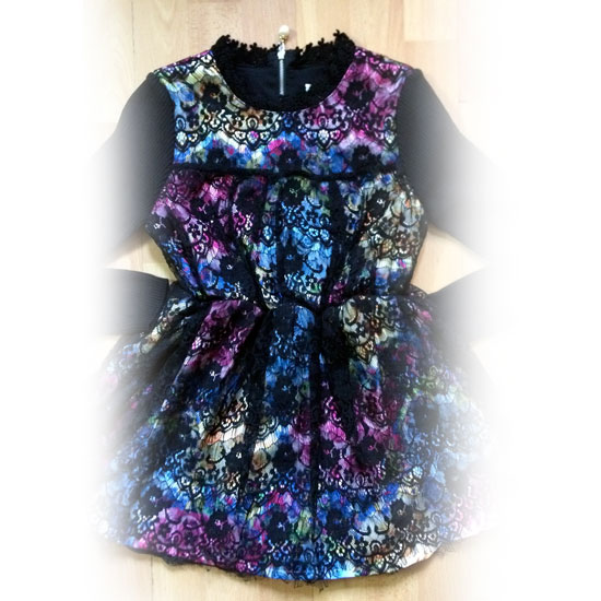 This is a beautiful dress with an eye-catching and trendy look. It features long sleeves in black and is printed with colorful patterns. The dress is finely designed with exquisite black lace for enhanced uniqueness and elegance.