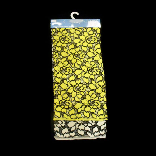 This yellowish lace fabric features a contrasting black-colored trim. Carefully made, the lace fabric has a beautiful crochet pattern. This lace fabric is well-suited for making ladies' garments.