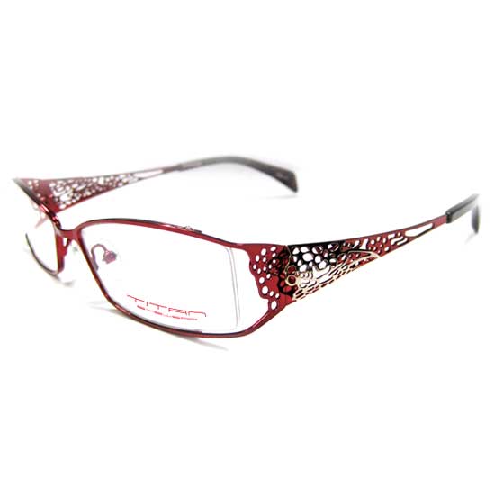 Highlighted here is an elegant spectacle frame designed for ladies. Wonderful lace patterns on the temples are sophisticated and stylish. Metallic materials in red and silver look charming and modern.