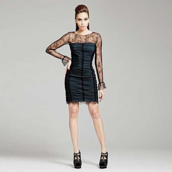 This extravagant party dress features black lace materials on the sleeves and the front. The pleated dark green tube dress creates a Gothic touch with the black lace. Fancy detail at the cuff and the hemline finishes this gorgeous dress.