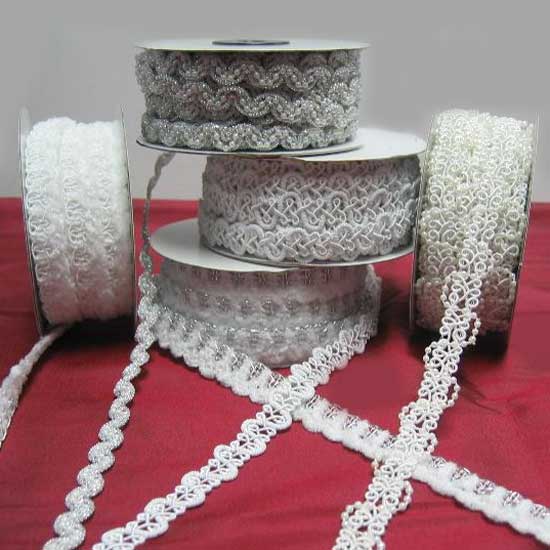 These lace trimmings come in various widths to suit different needs. They are crafted with detailed workmanship for a delicate touch. Embellish any clothing designs with these high-quality lace trimmings.