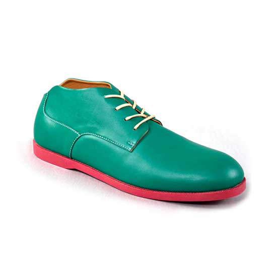 This lace-up shoe comes with a green upper and a red sole for an eye-catching look. The leather-like appearance with a polished finish lends a subtle touch easily. This comfortable shoe brightens up your image instantly.