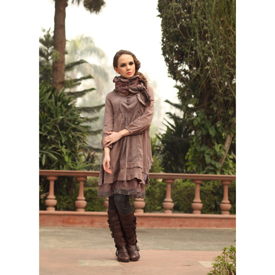 This ladies' tunic features a fancy design with a pair of 3/4 sleeves and a layered construction. The decorated patterns and buttons on the front give it a sweet, charming look. You can pair this tunic with a pair of pants and boots for a relaxed, effortless look.