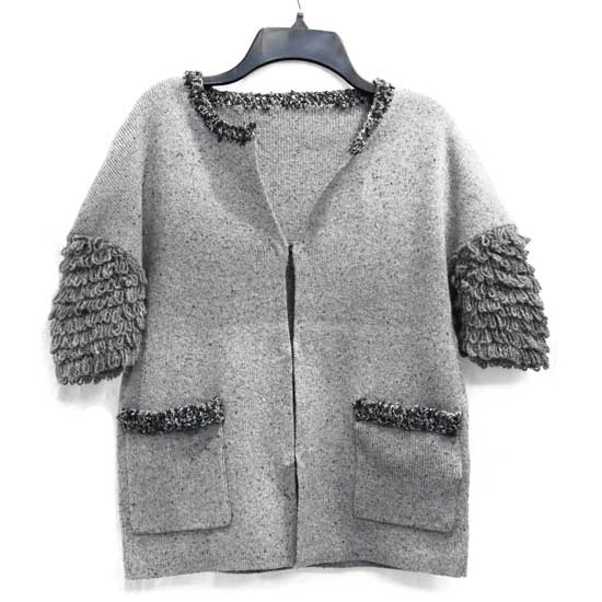 This ladies’ cardigan in gray features medium-length sleeves with dark gray woolen yarn details. The yarn decorations on the collar and pockets also highlight the look. This fashionable cardigan updates your image instantly.