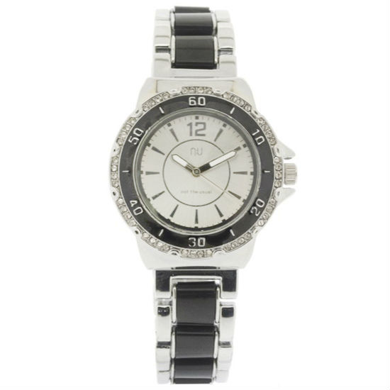 - Silver and black colored metal alloy case with crystal detailing on the bezel.