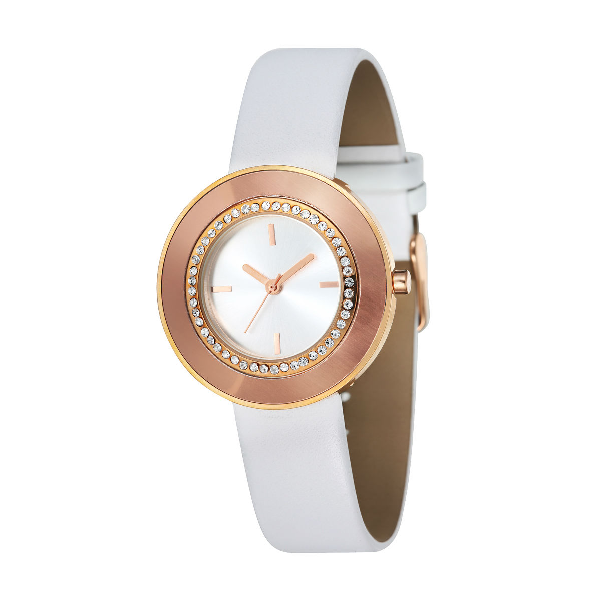 Embrace your feminine nature with this disc-shaped fashion watch in a current rose gold tone that gives out a striking aura of elegance. This luxurious timepiece outshines the season in a gleaming PP-stone-accented case and a genuine leather strap. 4 quarter batons mark the sunray dial of this effortlessly sophisticated watch. Sturdily constructed, this watch is built of durable alloy and water-resistant up to 3 ATM.