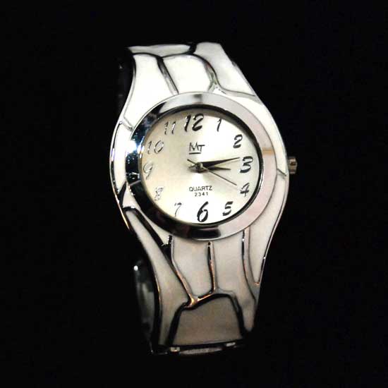 This quartz watch comes with a bangle design in white. The silvery details on the bangle showcase extra uniqueness. The circular dial clearly displays the time to the user. Complement your attire with this special timepiece.