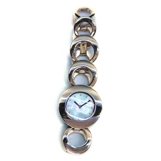 Highlighted is a ladies' automatic watch with a bangle constructed by circular links. The stainless steel case is well brushed. Enhance a casual dress in style with this brilliant automatic watch.