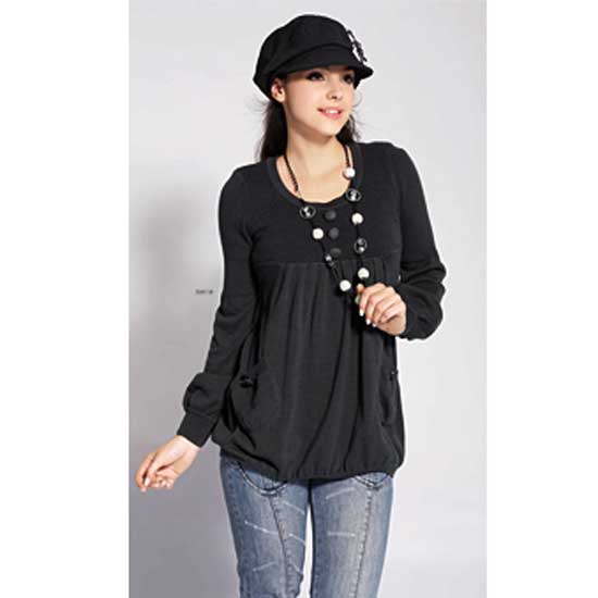 This chic baby-doll blouse features long puff sleeves and a loose-fitted bodice. It comes with two patch pockets on the front for a playful look. This cute baby-doll blouse is a great addition for young ladies.