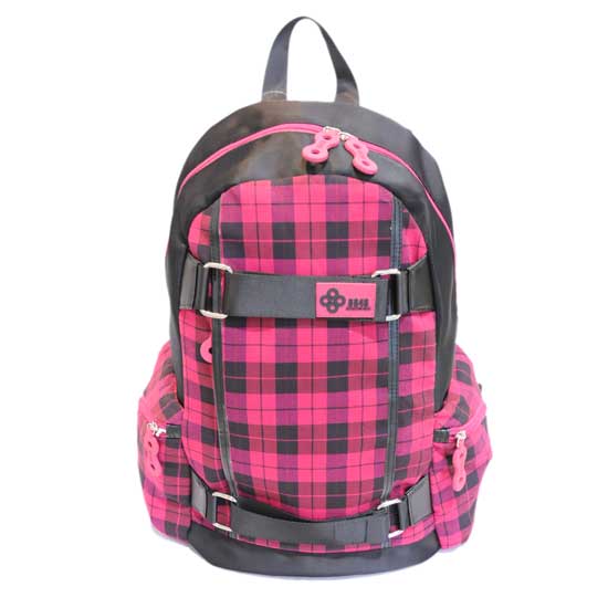 This ladies’ backpack features a captivating pink and black checked pattern. The sides are skillfully designed with bottle compartments for added functionality. The black buckled straps on the front lend extra style.