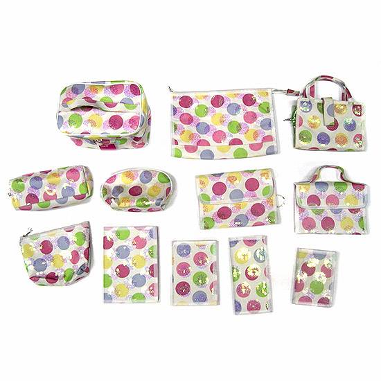 These are a wide range of girls' and ladies' bags with a colourful dotted pattern, which include cosmetic bags, wallets, small handbags and pencil bags. They are all young and trendy in style and are great for matching fashionable clothing.