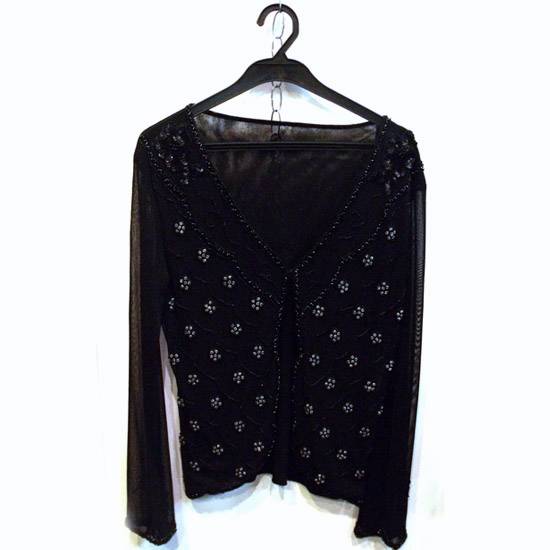 This is a long-sleeve V-neck cardigan with a clasp closure. It is embellished with flower-shaped beads for a feminine look. Update your wardrobe with this elegant beaded cardigan.