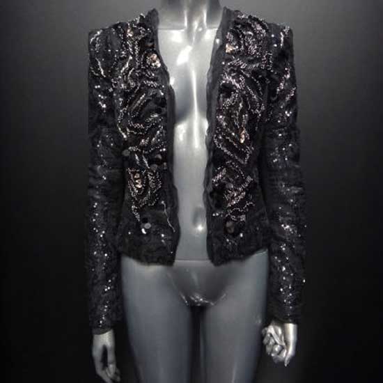 This ladies' beaded jacket has a tailored structure that flatters many ladies. The detailed beaded pattern makes a bold fashion statement. The open-front design creates a sleek, casual look that suits many occasions.