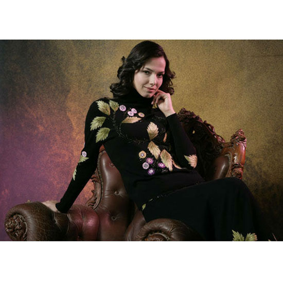 This feminine sweater features elegant floral and plant patterns on the sleeves and front. The sharp colors of these adornments stand out from the modest, black background. This sweater is a beautiful addition to your winter wardrobe.