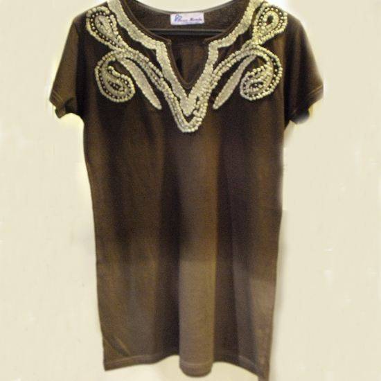 The sophisticated short-sleeve T-shirt bestows a split neckline, adding a stylistic touch to the plain design. The lustrous beads heavily adorn the neckline and radiate vibrantly to form an exquisite tribal pattern. The straight-cut T-shirt with extremely breathable material makes an indubitably excellent garment for the hot summer.