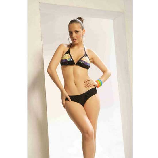 This two-piece bikini features a fashionable design and a flattering fit. The halter-neck bra is accented with two-toned sequins for added appeal. The two-piece bikini is perfect for a variety of action sports such as beach volleyball, surfing, swimming, etc.