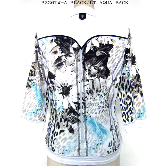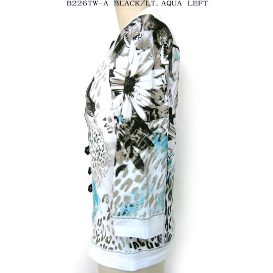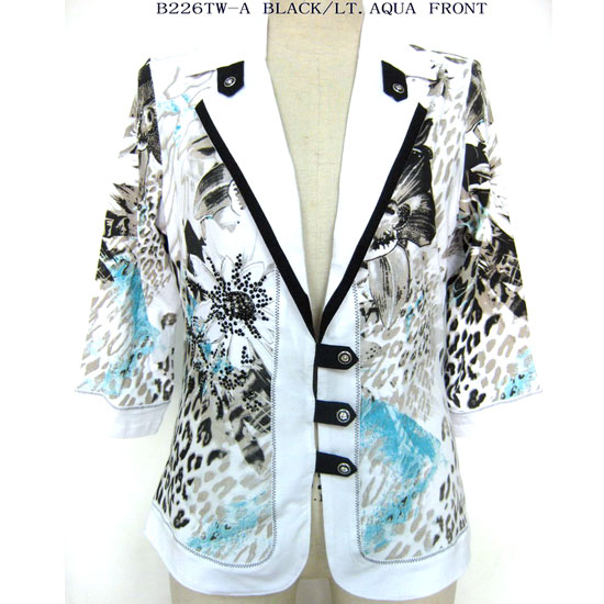 Showcased is a ladies’ blazer designed with a slim cut and middle sleeves. The blazer comes with a unique match of floral and animal prints in black, white and aqua blue. Black straps are added to make this design even more eye-catching.