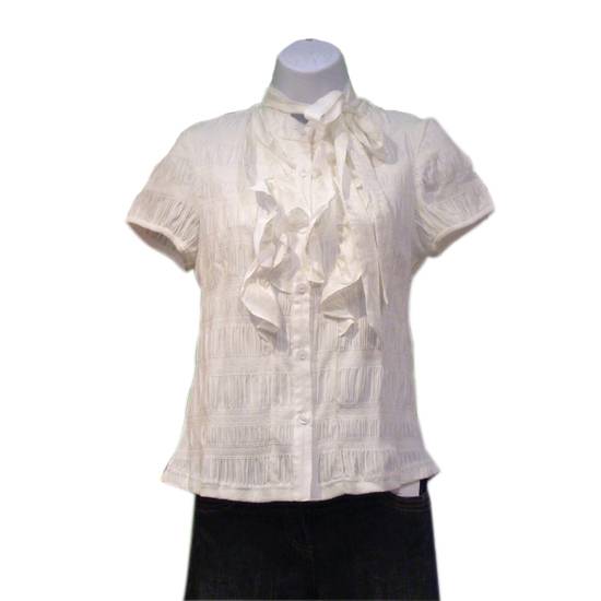 • The white ladies' blouse is made with seersucker material and designed with ruffles at front.