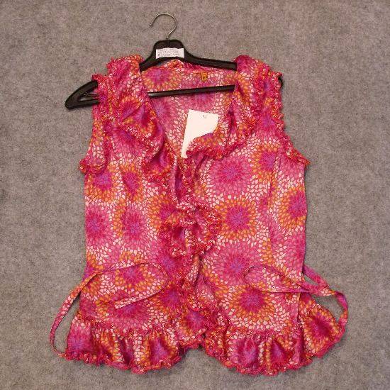 This colorful sleeveless blouse features a beautiful ruffled V-neck and hem. It comes with two self-tie strings on both sides for better fitting. It has bright fireworks-like patterns all over. Slip into this lovely blouse to turn up the heat on your vacation look.