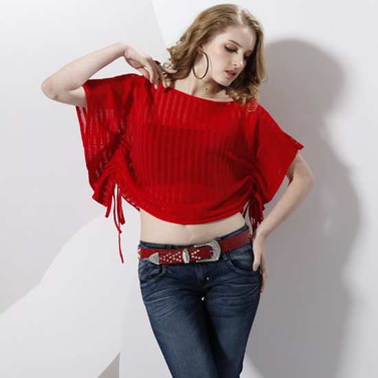 This beautiful blouse features a short cut with bat-sleeves. The delicate knitted patterns make it look feminine. Ladies will look exceptionally fabulous in this sharp red blouse.