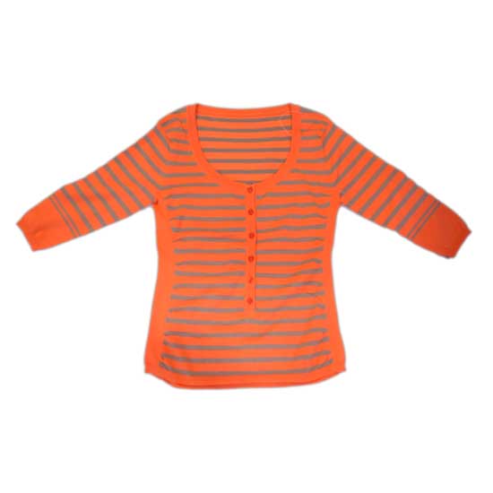 This ladies' blouse boats a pleasing casual style for ladies. The blouse is sharp orange in color, with gray striped patterns. This round-neck and middle-sleeve blouse looks great with simple jeans.