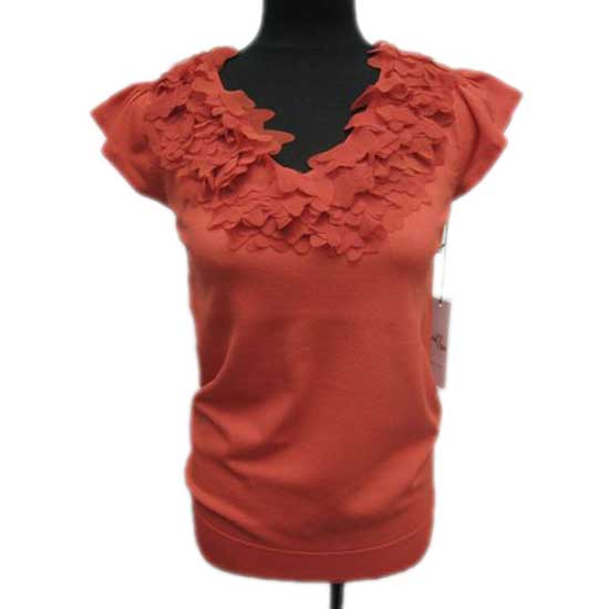 This ladies' blouse features a pair of cap sleeves with a V-neck. The neck comes with clusters of petals for a feminine accent. The stretchy fabric offers ultimate comfort with a body-conscious silhouette. This is simply a lovely top to pair with your favorite skirts.