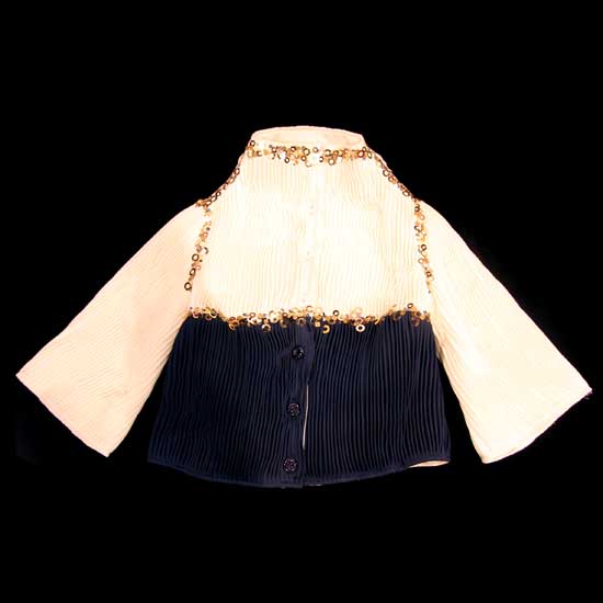 As shown is a ladies’ blouse coming with a unique cut. The short-cut blouse features a wide turtle neck and bell sleeves. The blue-and-white velvety fabric is embellished with golden sequins for a glamorous look.