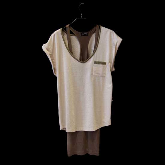 This pictured blouse gives a relaxed fit with wider sleeves. The metallic jersey in beige interprets a down-to-earth style. The wide-neck top is nice to pair with a tank top inside.