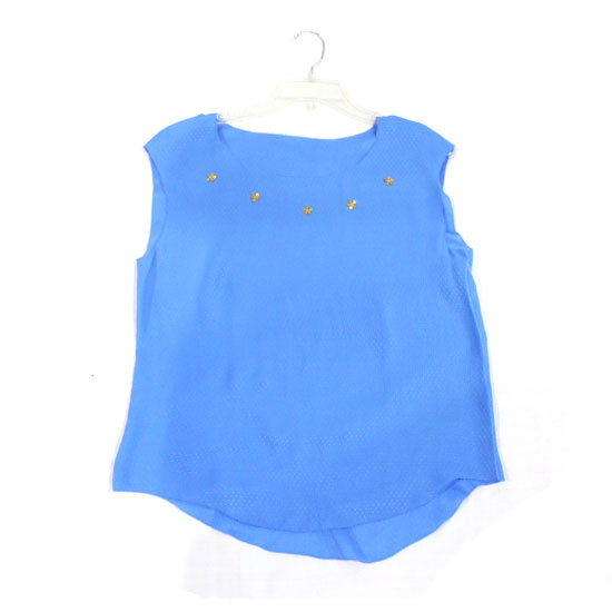 This ladies’ blouse comes in bright blue allover for an eye-catching look. Made of silk, this sleeveless blouse offers a tender and smooth touch for wearing. The five plastic decorations are added for an exquisite accent.