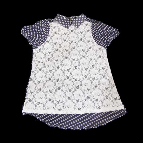 This is a ladies' blouse that is made of 100% polyester for ultimate wearing comfort. The classic point collar and short sleeves are accented with white small dotted prints on the background of dark blue. The allover floral details in white add subtle elegance and uniqueness to the look of this stylish blouse.