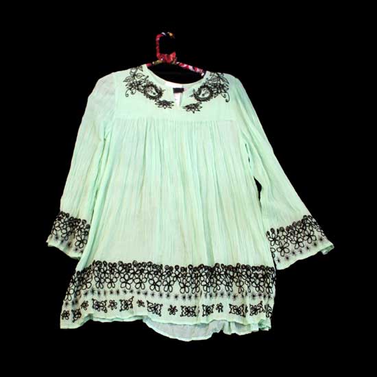 This is a ladies' blouse with a loose-fit design. It is crafted in light green with pleats. The black floral decorations on the neckline, hem and cuffs add an elegant touch to this blouse.
