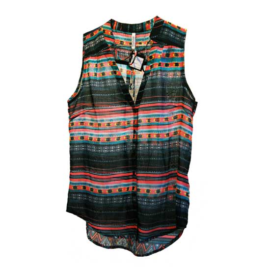 This is a sleeveless ladies' blouse with a low-cut V-shaped neckline and an asymmetric hem. It is printed with assorted sophisticated horizontal stripe patterns in different deep and bright colors. This piece surely is a fashionable choice for summer wear.