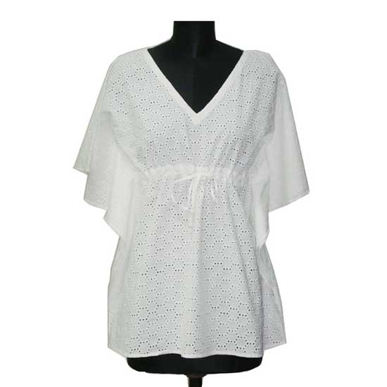 This is a ladies' blouse in pure white featuring large bat sleeves and a deep V-shaped neckline. It comes with an adjustable strap in the waistline for a flattering fit. The exquisite hollow patterns add a feminine and chic touch to this design.