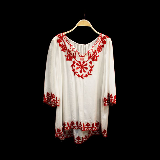This is a ladies' blouse that comes with eye-catching red decorations. Made of silk and cotton, this blouse is smooth and comfortable. This fashionable blouse is great for daily wear.