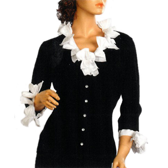 This ladies’ blouse is truly flattering with its exquisite details around the neckline and cuffs. The faux button-up front introduces a touch of uniqueness. The all-black design is great for a sophisticated look.