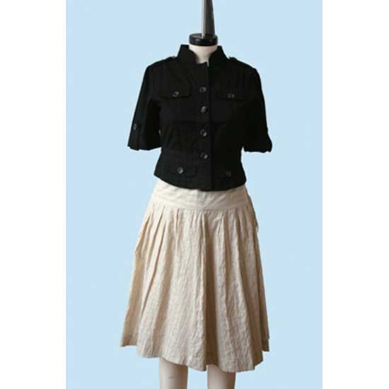 As shown here is a black jacket with a contrasting beige skirt. The jacket features middle sleeves with a standing collar. The skirt looks elegant with a slightly ruched texture.
