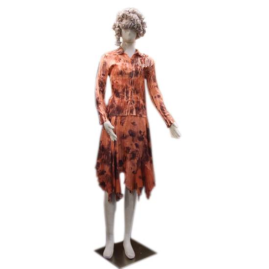 The blouse is pleated and it has long sleeves and a pointed collar.