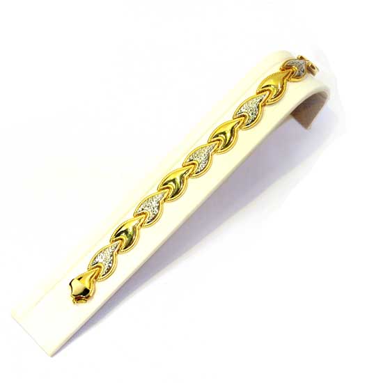 The ladies' bracelet features a chain of uniquely-shaped 14k gold embellishments. They are alternately inlaid with Cubic Zirconia stones for enhanced appeal. This special and deluxe bracelet will surely turn heads in any high-end settings.