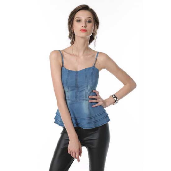 This is a ladies' cami top made of high-quality washed denim in blue. It features ruffle and flare cutting with exquisite details. This tank top surely is an ideal choice for fashionable ladies.